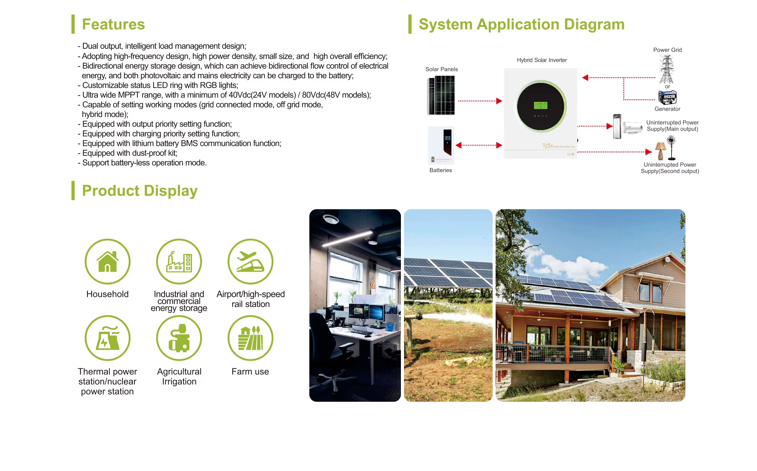 - Ultra wide MPPT range, with a minimum of 40Vdc (24V models)/80Vdc (48V models); 5. Equipped with grid connected current setting function; 6.Equipped with output priority setting function;